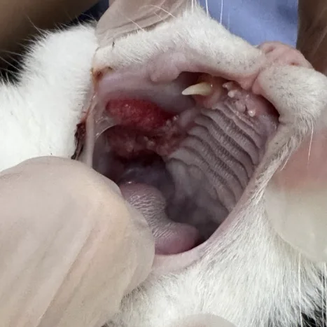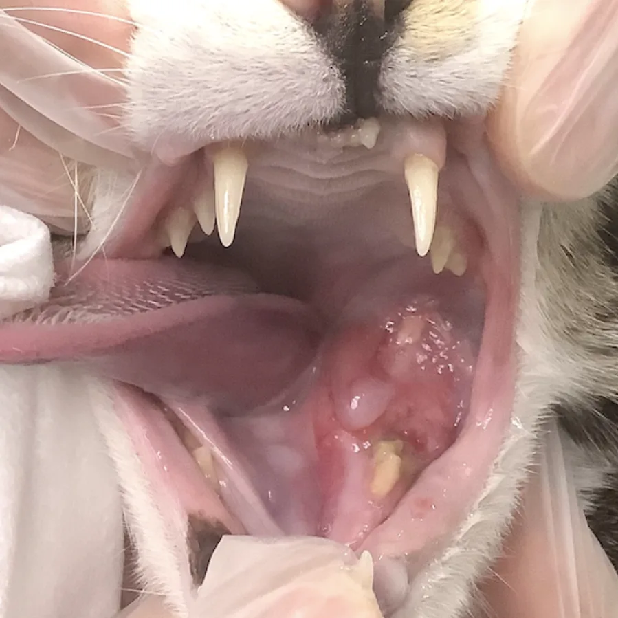 猫の口腔内扁平上皮癌は、猫に発生する口の中の悪性腫瘍の中で最も一般的な腫瘍です。発生部位は主に舌下、下顎歯肉、頬の内側(頬粘膜)、扁桃などで、特に下顎骨周囲にできることが多く見られます。この腫瘍は局所浸潤性が非常に強く、周囲の骨や軟部組織を破壊しながら広がります。一方で、遠隔転移(肺など)は比較的まれですが、腫瘍の拡大によって「食べられない」「痛い」「よだれが止まらない」などの症状を引き起こし、生活の質(QOL)を著しく損なうことがあります。口の中の腫瘍は、初期では見逃されることが多く、症状が出た時にはかなり進行していることもあります。代表的な症状は、口を気にして前足で掻く、よだれが多い、食べにくそう・硬いものを食べなくなった、口から血が出る、食欲の低下などがあります。