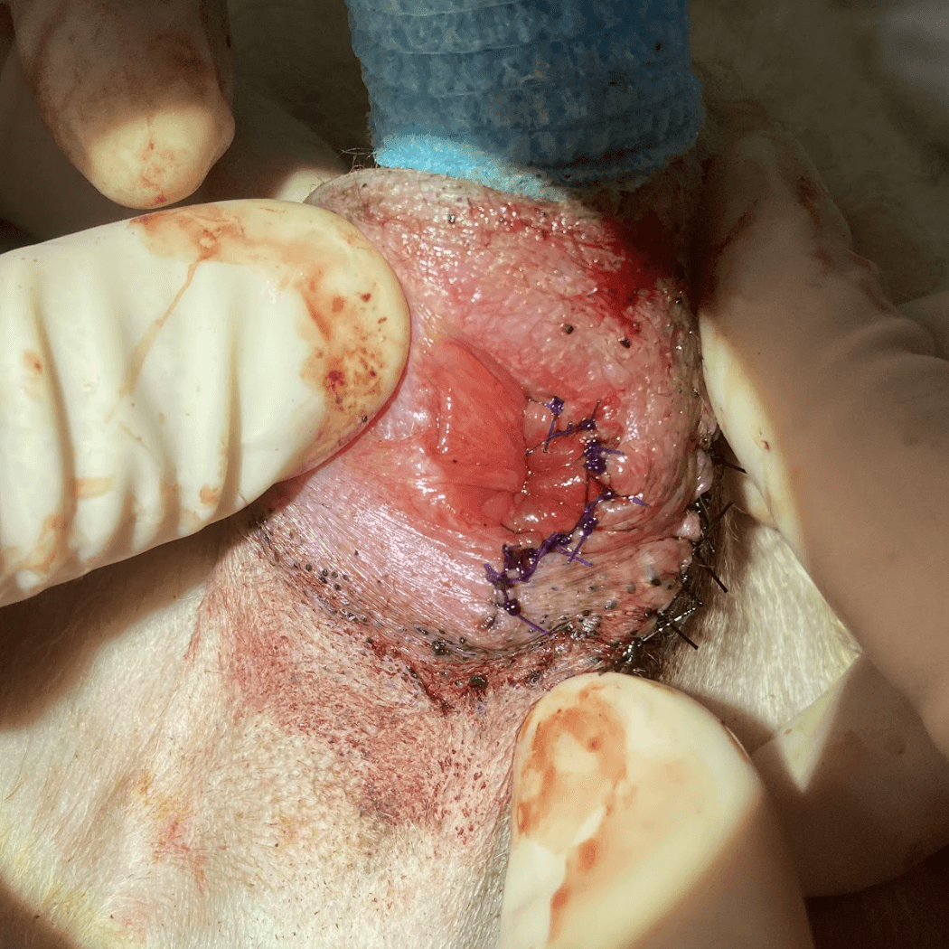 2、悪性腫瘍を疑う+腫瘍サイズが小さい場合:便失禁が起こらない範囲で広めに切除+去勢手術