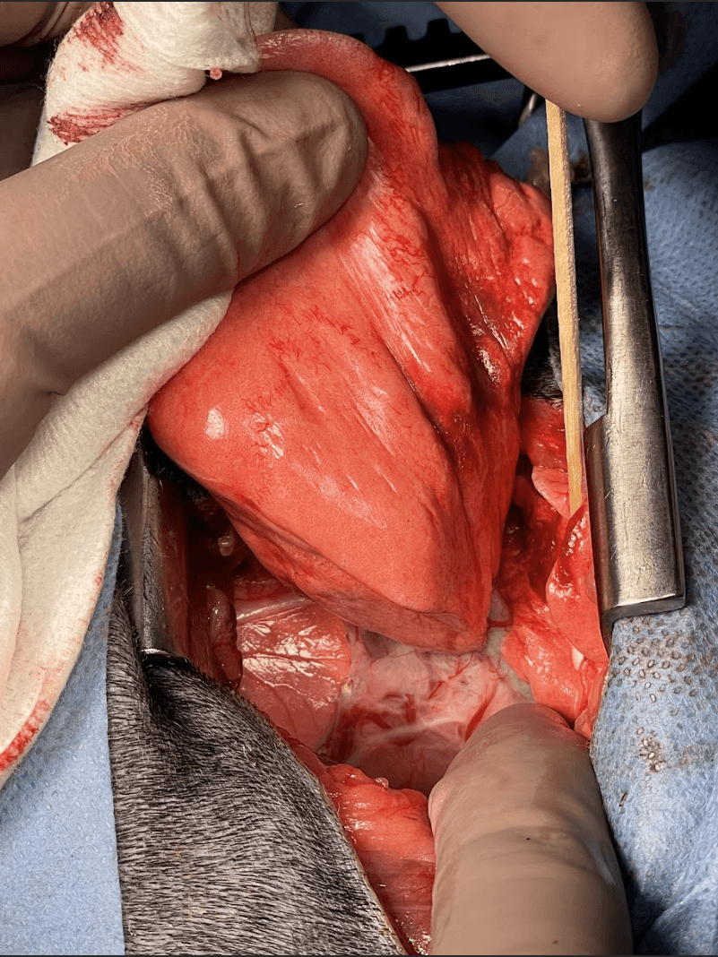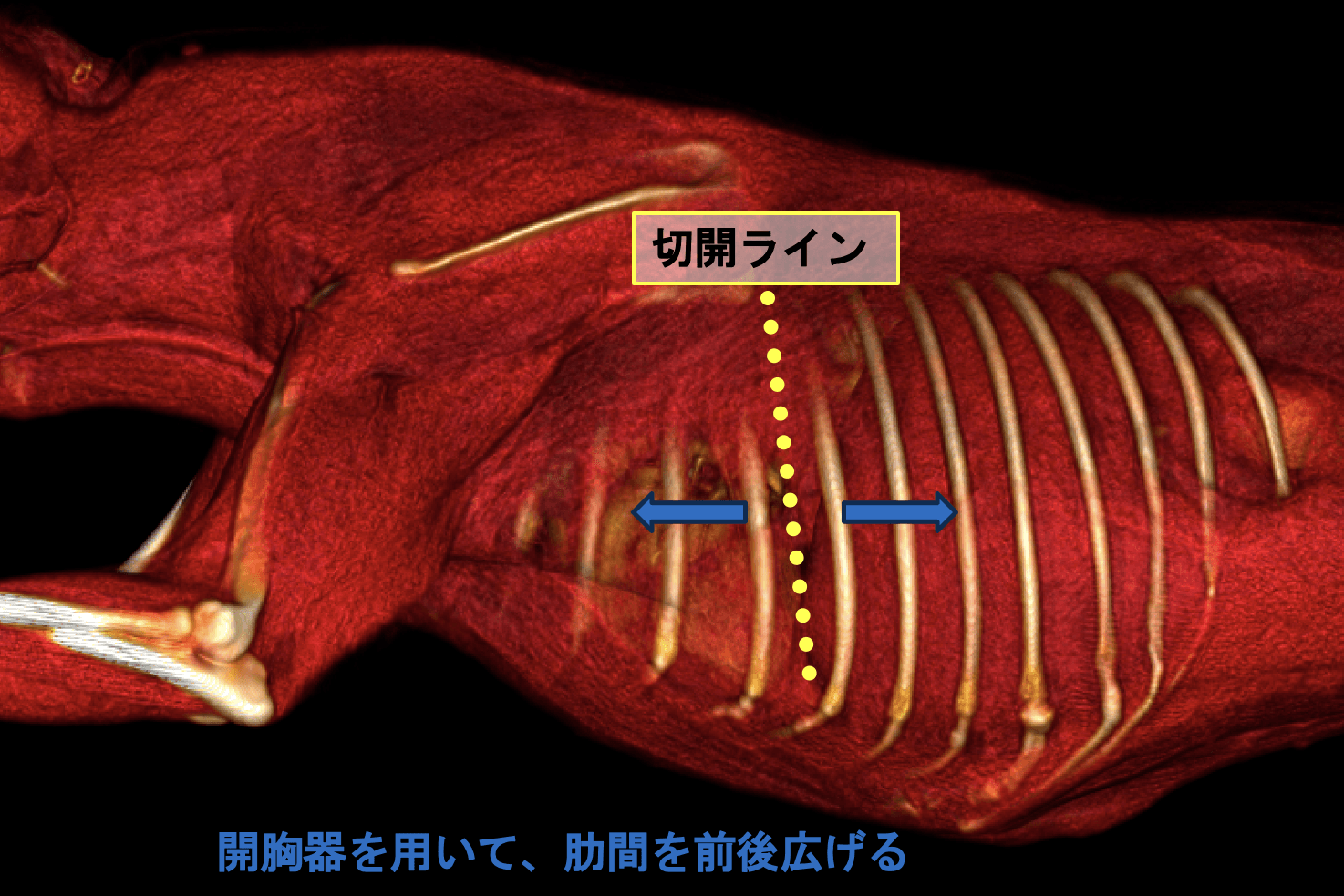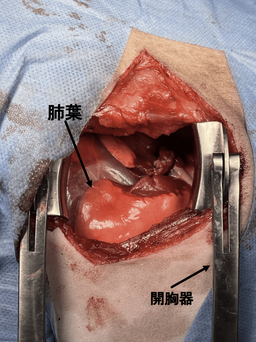 肋間開胸術により胸腔内へアプローチし、肺葉切除術を実施します。
