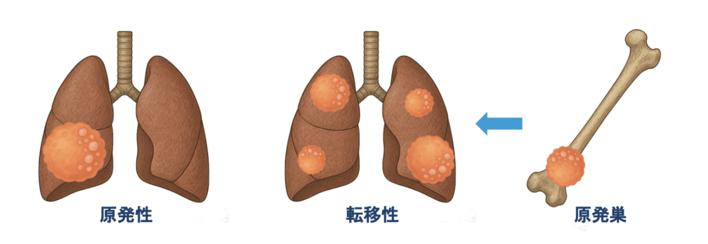 転移性肺腫瘍では、複数の小結節が肺全体に認められます。