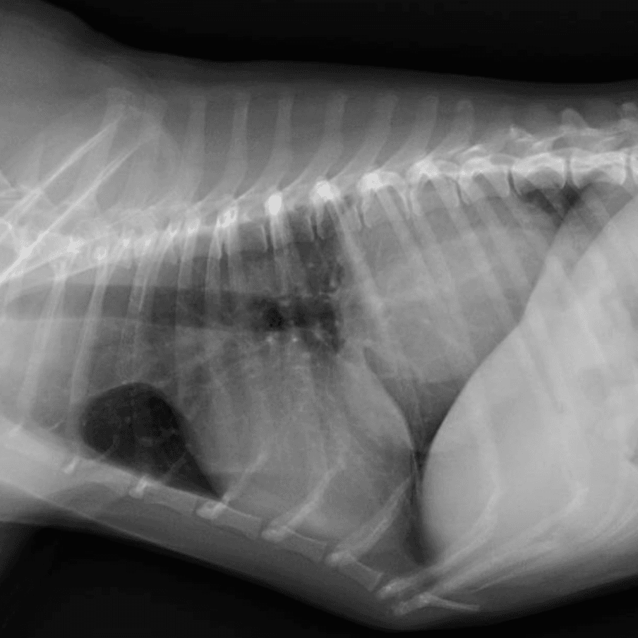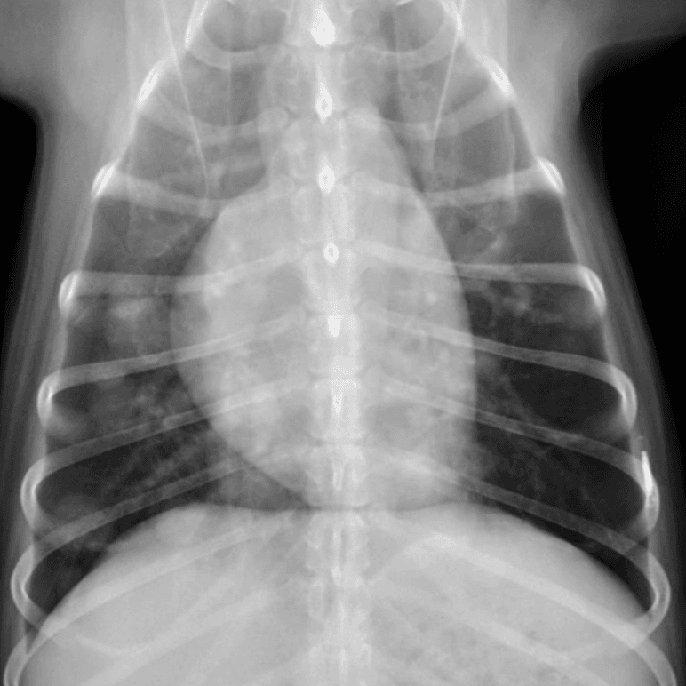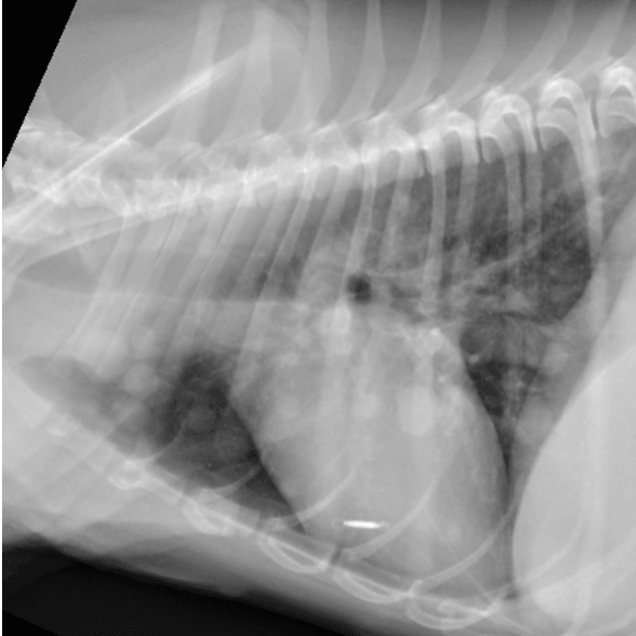 犬の肺腫瘍は発生頻度としては高くありませんが、診断時にはすでに進行していることが多い腫瘍です。肺腫瘍は大きく、肺そのものから発生する原発性肺腫瘍と、他の臓器の腫瘍が肺へ転移した転移性肺腫瘍に分類されます。犬では、転移性肺腫瘍が多数を占め、原発性肺腫瘍は比較的まれとされています。原発性肺腫瘍では肺腺癌が最も多く、一部の犬種(バーニーズマウンテンドック、ウェルシュコーギー)では組織球性肉腫が多いとされています。一方、転移性肺腫瘍は、乳腺腫瘍、骨肉腫、軟部組織肉腫など、さまざまな悪性腫瘍に続発して認められます。肺は予備能力の高い臓器であるため、腫瘍がある程度大きくなるまで症状が現れにくいという特徴があります。そのため、肺腫瘍は健康診断の胸部レントゲン検査や、他の病気の精査中に行われた画像検査、あるいは原発腫瘍の転移検索として実施されたCT検査で偶発的に発見されるケースも少なくありません。進行すると、腫瘍の増大や多発化、胸腔内環境の変化により呼吸器症状が顕在化し、治療選択が限られることもあります。このため、早期の発見と正確な病期評価が、治療方針を決定するうえで非常に重要となります。