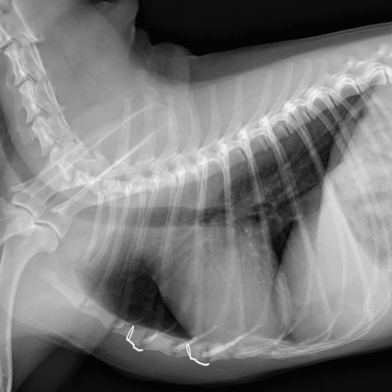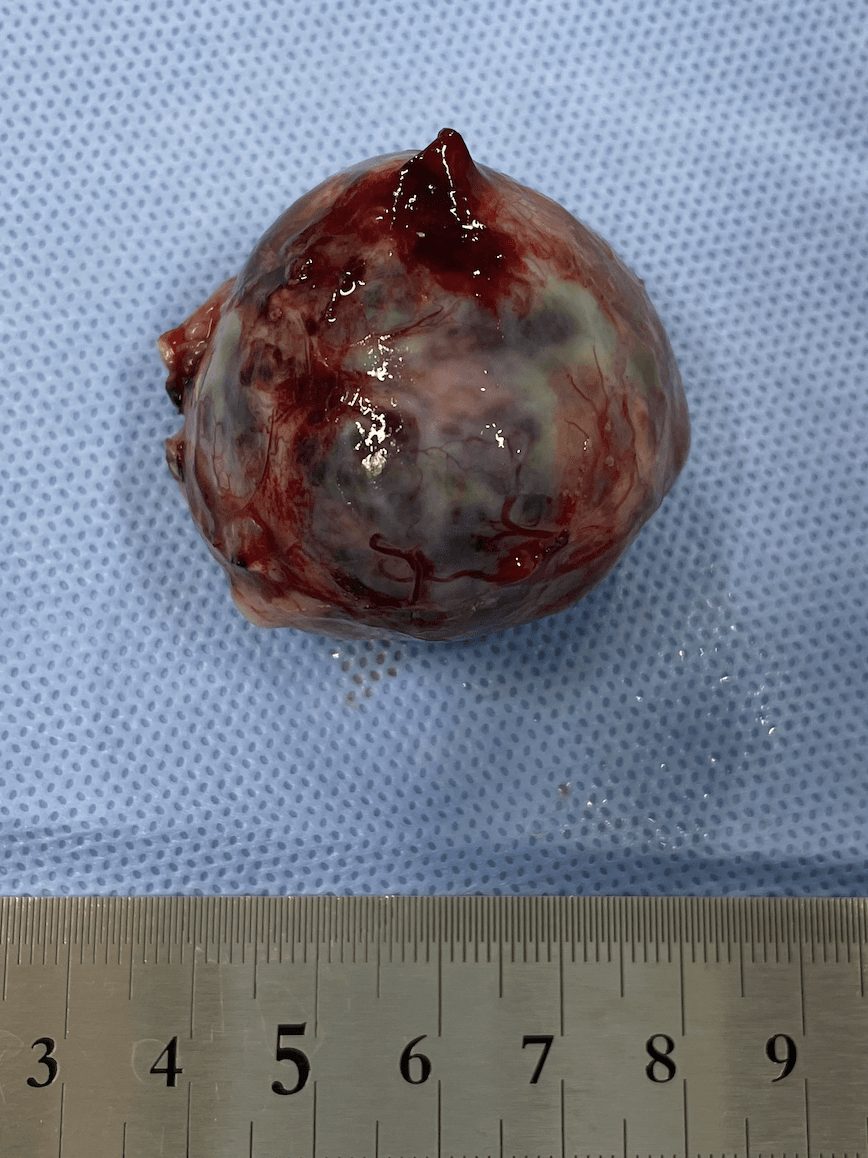 胸腺腫は、健康診断や他の検査の際に偶発的に見つかることも多い腫瘍です。そのため、発見時には症状がなく、「今すぐ治療をする必要はないのでは」と感じられることもあります。しかし、無治療のまま経過をみていると、腫瘍は徐々に大きくなることが多く、進行に伴って呼吸困難や咳などの症状が出てくる可能性があります。また、腫瘍が大きくなることで外科摘出が困難になる場合もあります。一方で、外科的に完全摘出ができた場合には、完治が期待できる腫瘍でもあります。そのため、全身状態や検査結果を踏まえたうえで、手術が可能と判断される場合には、積極的な外科治療が推奨されます。胸腺腫の手術は、胸を開ける外科手術となるため、術後には一定の痛みを伴います。そのため、十分な疼痛緩和を行うこと、また呼吸状態を注意深く評価・管理することが非常に重要です。当院では、術後の痛みや呼吸の状態を丁寧に確認しながら、その子に負担の少ない形で適切な術後管理を心がけています。