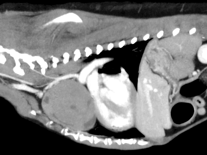 胸腺腫は比較的まれな腫瘍であり、ラブラドールレトリーバーやゴールデンレトリーバーで多く報告されています。胸腺上皮細胞由来の腫瘍であり、リンパ球や肥満細胞が含まれています。稀に浸潤性を示すことがあり、悪性胸腺腫などと呼ばれる場合がありますが、転移は稀とされています。症状としては、咳や呼吸困難、運動不耐性などがありますが、胸部レントゲン検査を実施した際に偶発的に発見される場合もあります。また、重症筋無力症が胸腺腫に関連して発生する(腫瘍随伴症候群)ことがあります。重症筋無力症により巨大食道症が発生し、誤嚥性肺炎による死亡するケースが多いです。