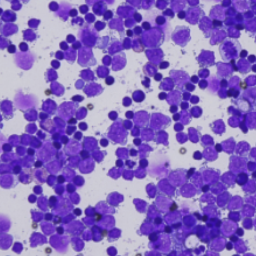 縦隔型リンパ腫の場合:胸水中に腫瘍性リンパ芽球が確認されます。